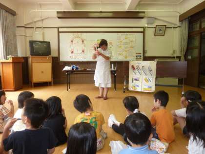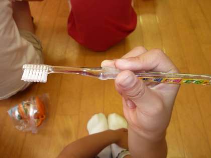 歯磨き巡回指導の後半は,歯の磨き方の練習でした。最初に歯ブラシの正しい持ち方を教わり,次に実際に歯ブラシを使って歯を磨く練習をしました。歯ブラシの正しい持ち方は「鉛筆持ち」,正しい磨き方は「こちょこちょ磨き」,正しいうがいの仕方は「ぶくぶくうがい」ということを子どもたちは知りました。