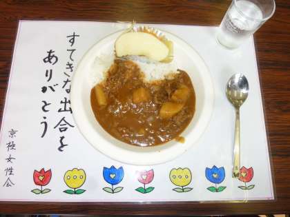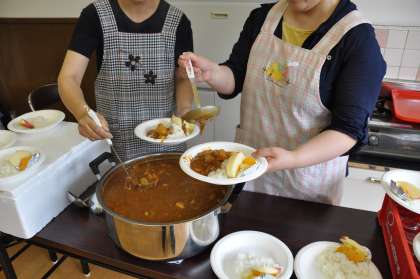 「折り紙」と「絵手紙」を楽しく行っていると,カレーの美味しそうなにおいが漂ってきました。正午少し前,カレーが出来上がり,どんどんと盛り付けられていきました。画像中でご覧のように,とっても美味しそうなカレーライスでしょう。デザートにウサギのリンゴやミカン,パイナップルもついていました。手を合わせて「いただきます。」。「カレーライスの会」の始まりです。