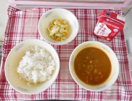 カレーは,給食室でルーから手作りしています。サラダ油・バター・小麦粉・カレー粉・脱脂粉乳・チーズ・ヨーグルト・トマトピューレ・フルーツチャツネ・バーベキューソース・ウスターソース・塩・こしょう・ガーリックパウダー・オールスパイス・こいくちしょうゆ・ローリエを使っています。栄養だけでなく,愛情もたっぷりです。