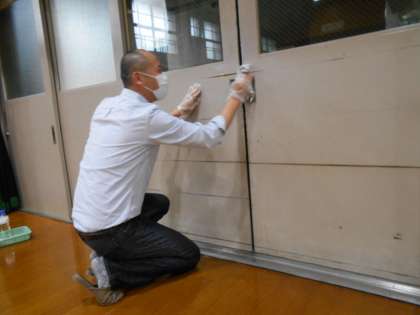 今日は,PTA会長さんがボランティアとして,体育館の消毒をしてくださいました。