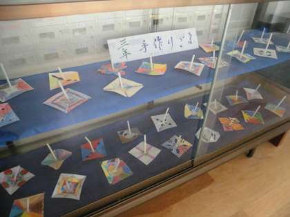 【写真上】本館入口のガラスケースに,3年生がつくったこまが展示されています。国語科「こまを楽しむ」で登場した色がわりこまをイメージして制作しました。実際回してみると,それぞれの美しさが際立っています。