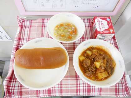 野菜の洋風煮は,たまねぎ・にんじん・キャベツ・コーンをチキンスープで煮ています。こちらは,かくし味としてローリエが入っています。