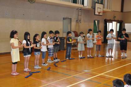 3年生は最初に「小さな世界」を,楽しそうに歌いました。続いて3年生になって初めて習ったリコーダーを全員が使って,「笛星人」の演奏をしました。最後にリコーダーのほかにトライアングルと鈴を入れて,「笛星人」の合奏をしました。3年生の子どもたち一人一人は,リコーダーの演奏が段々と上手になってきているようです。