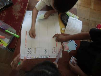 【写真中・下】社会科の授業の様子です。これまで,家の人はどこでどんな品物を買ったのか聞き取りをしてきました。今日は,その調査結果をもとに「買い物調べグラフ」を作成しました。そして,出来上がった資料をもとに気付いたことや不思議に思ったことを交流し,学習問題を深めました。