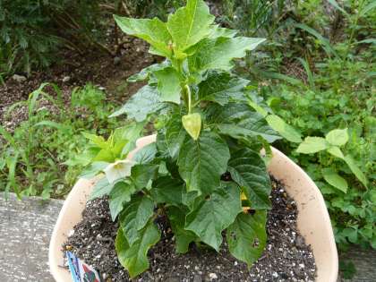 本館と新館の間にある花壇に置かれた植木鉢で,「ほおずき」が白い花を咲かせているとともに,とても小さくてかわいい「ほおずき」が姿を現しています。