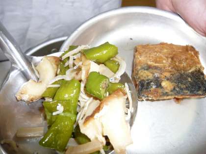 今日の給食の献立は,「ごはん」,「牛乳」,「さばのたつたあげ」,「伏見とうがらしとじゃこのいため煮」,「すまし汁」でした。とうふとほうれん草,みょうがの入った「すまし汁」とともに,「さばのたつたあげ」と「伏見とうがらしとじゃこのいため煮」をおいしくいただきました。