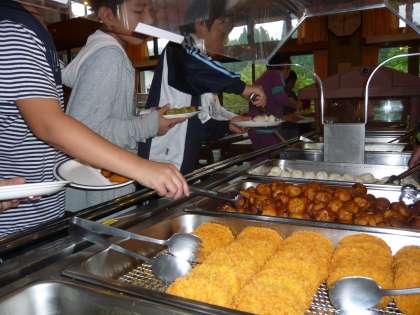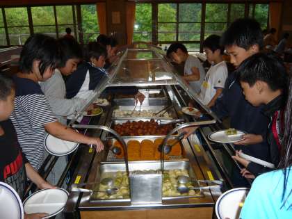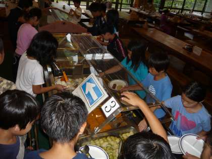 午後5時からの入浴を済ませ,寝具の準備を行い,少し休憩をした午後6時から,食堂での夕食が始まりました。手をしっかりと洗って,トレーと仕切り皿,箸,茶碗,湯のみを手に席に着いた子どもたちは,仕切り皿をもってバイキングカウンターへ。今夜のおかずは「ロールキャベツ」に「牛肉コロッケ」,「野菜の中華風あんかけ」等で,仕切り皿にいっぱいのおかずをのせて席に帰ると,大きな口をあけてしっかりと夕食を食べていました。
