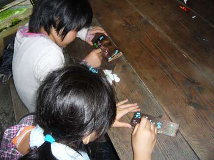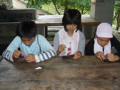 朝食のパックドッグをおいしく食べた後の午前中の活動は,前もって杉の板を焼いて,きれいに磨いたものに,文字や絵を書き込む活動を行いました。カラーテックスや油性の絵の具を使って,思い思いの文字や絵を焼き杉板に,真剣に書き込んでいました。