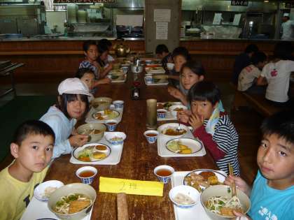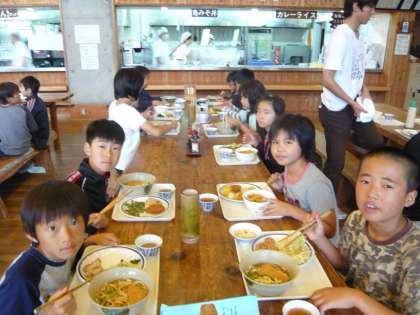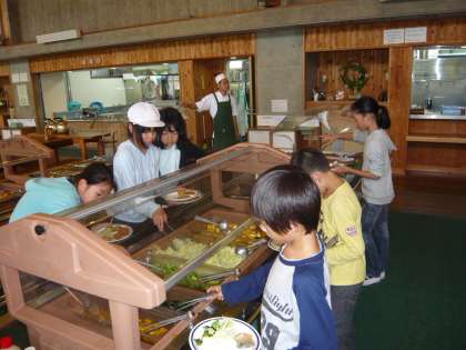 4日目の今日の昼食は,本館にある食堂で食べました。「鶏みそ丼」が「カレーライス」,「うどん+かやくごはん」の3種類の主食から一品を選び,バイキングカウンターで,「ソフトメンチカツ」,「カレールー包み揚げ」,「さばの竜田揚げ」などのおかずをトレーにとって食べました。ちなみに主食3品のうちの一番人気は,ダントツで「うどん+かやくごはん」でした。何はともあれ,みんなおいしそうに昼食を食べていました。