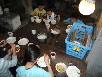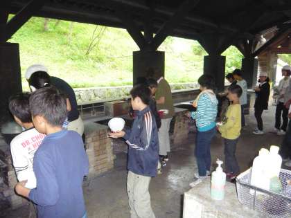 4日目の今日の午後の活動は,午後2時30分から夕食になる野外炊事を行いました。夕食は「野外バイキング」で,1班は「カレー」を,2班は「ハヤシライス」を,3班は「豚汁」を,4班は「鶏すき焼き」をつくりました。自分たちの班がつくったものだけでなく,各班がつくったものも食べました。どの班のものも,とってもおいしく出来上がっていました。