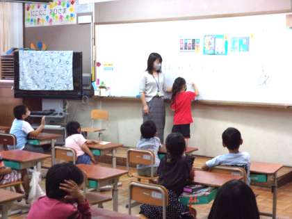 1年生と2年生は始業前の朝の会。「さあ,きょうもがんばるぞ!」