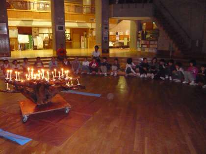 昨日の夜の活動は「キャンプファイヤー」の予定でしたが,始める前に雨が降り出し急遽,本館ホールでの「キャンドルファイヤー」になりました。とはいえ,外と中との違いだけで,子どもたちは十分に「山の家」最後の夜が楽しめたようです。