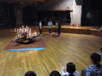 昨日の夜の活動は「キャンプファイヤー」の予定でしたが,始める前に雨が降り出し急遽,本館ホールでの「キャンドルファイヤー」になりました。とはいえ,建物の外と中との違いだけで,子どもたちは十分に「山の家」最後の夜を楽しむことができたようです。