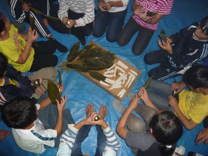 午前9時から「北山民家」で,「ちまきづくり」を行いました「北山民家」での「ちまきづくり」は,一人3本ずつ笹とイグサを使って「ちまき」を巻きました。器用にちまきを巻く子,なかなか巻けない子,いろいろでしたが,何とか全員が巻き上がり,今蒸してもらっている最中です。昼食のあとに1本は食べることができるようで,もう2本はお土産になる予定です。