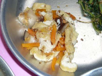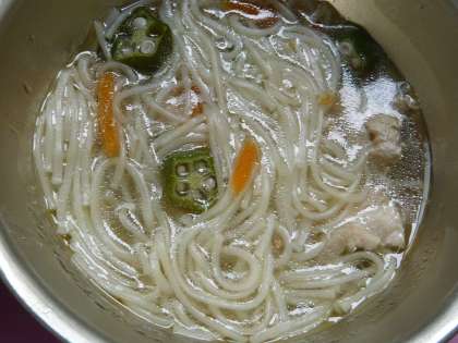 こぎつねちらしは細かく切った「油揚げ」と「にんじん」,「しいたけ」と「いりごま」が入り,米酢や砂糖,塩,薄口醤油などで味付けがしてありました。ご飯にこぎつねちらしの具(画像上)を混ぜて「こぎつねちらし」をつくり,おいしくいただきました。また,「七夕そうめん」(画像中)はそうめんを天の川に,オクラを星に見立ててつくってあり,見た目にも「七夕」という感じがしました。ちなみに,オクラの切り口は星の形をしていました。