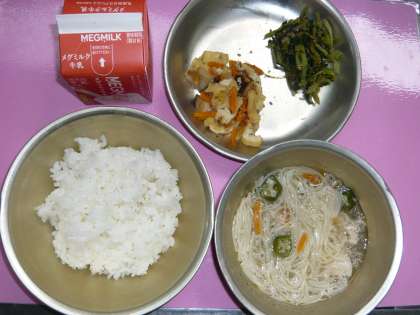 今日の給食の献立(画像下)は,「こぎつねちらし」,「牛乳」,「だいこん葉のごまいため」,「七夕そうめん」でした。
