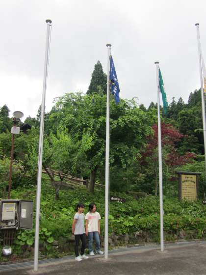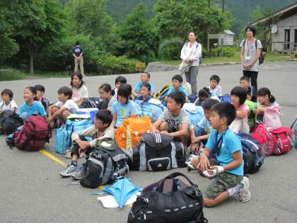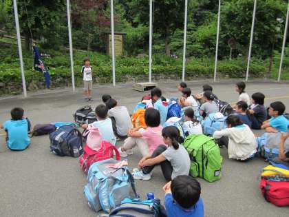 午前9時20分に学校を出発し,午前9時30分にバスに乗車して山の家を目指して出発した5年生の子どもたちは,バスの乗ること約1時間で山の家に到着し,すぐに「入所式」を行いました。入所式は,山の家の所員さんのお話,代表の誓いの言葉,校歌を歌いながら旗揚げと続きました。入所式が4泊5日の花背「山の家」での,長期宿泊・自然体験学習の幕開けでした。