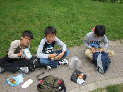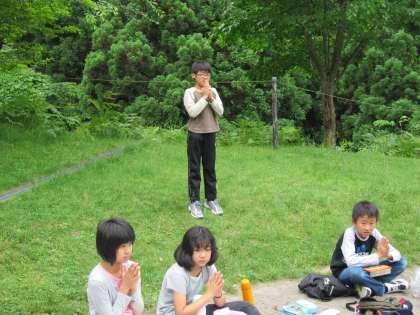 入所式を済ませた5年生の子どもたちは,宿泊場所となるロッジ1の近くの芝生周辺に移動し,持参した弁当の昼食を食べました。周囲の目にも鮮やかな緑と美味しい空気,そして愛情たっぷりの美味しいお弁当に,昼食の時間はまたたく間に過ぎてしまいました。