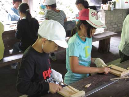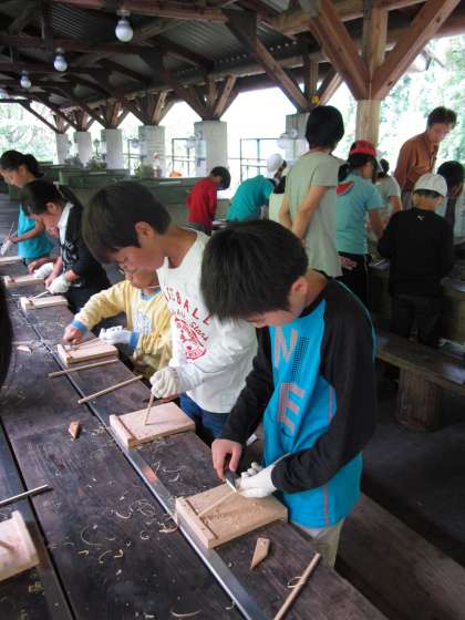 おいしく昼食を済ませたあと,午後0時30分から第2野外炊飯場で「竹はしづくり」を行いました。小刀を使って竹を削ったり,紙やすりで竹を磨いたり,日本で一つの,いや世界で一つの「マイはし」が出来上がりました。出来上がった「マイはし」は,山の家で食事をする際に必ず使いました。