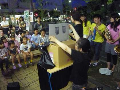 例年より早く梅雨が明けた7月8日(金)と9日(土)の2日間,七夕前後の風物詩となっている出町桝形商店街の「七夕祭り」が開催されました。両日とも午後7時30分から河原町通今出川交差点の北西角で,京極小学校図書ボランティア「かしの木」と同志社大学音楽サークル「PAZ MUSIKA」がコラボした,「おはなしとおんがくのゆうべ」が開催されました。