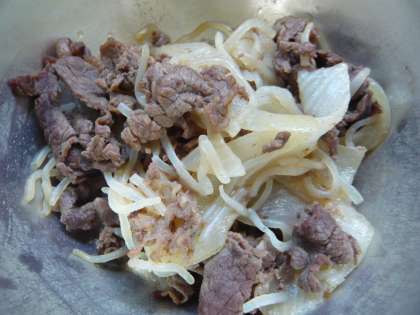 今日の給食は,「牛丼」でした。牛丼の具(画像上)は,「牛肉」と「たまねぎ」,「糸こんにゃく」で,「三温糖」や「料理酒」,「薄口醤油」,「濃い口醤油」などで味付けしてあり,麦ごはんにのせておいしくいただきました。
