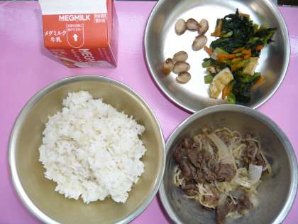 今日の給食の献立は,「牛丼」,「牛乳」,「小松菜の煮びたし」,「とら豆の甘煮」でした。「油揚げ」と「にんじん」,「小松菜」が使われた「小松菜の煮びたし」,「とら豆」を「三温糖」と「薄口醤油」で煮た「とら豆の甘煮」,ともに「牛丼」ととっても合っていて,牛丼と一緒においしくいただくことができました。