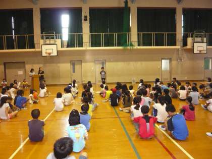 たてわりグループができてから始めての「児童朝会」が,今日7月12日(火)始業前に体育館でありました。この「児童朝会」は,児童会の計画委員の子どもたちが企画し,運営も行います。
