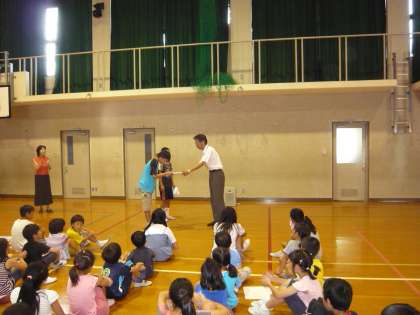 「爆弾ゲーム」と「ジャンケン列車(貨物列車)」の二つのゲームを楽しんだ後,計画委員の代表の「おわりの言葉」(画像左)で,今日の児童集会が終わりました。この後,永久歯が一度もむし歯になっていない6年生の,「よい歯の表彰」の伝達表彰式(画像右)を行いました。今年度「よい歯の表彰」を受けた6年生は,2名の男子でした。今回「よい歯の表彰」を逃した6年生は,中学3年生の時にもう一度チャンスがあるそうです。