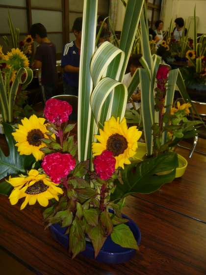 6年生と同じように,仕上がった生け花を前に記念写真を撮った後,女性会の方から5年生の子どもたちの生け花の講評を聞きました。下2枚の画像は,5年生の子どもたちの作品です。作品の出来栄えは,いかがでしょうか。