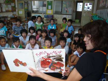1年生の子どもたちは教室の後ろに集まり,教室の床に座って担任の先生の読み聞かせを聞きました。読んでもらった絵本は「にげだした おにばんば」で,「小僧がおしょうさまから三枚のお札をもらって,山へ栗ひろいに出かけました。道に迷ってばさまの住む家に泊めてもらいました。夜中,小僧が目をさますと,おにばんばがほうちょうをといでいた…。」というお話でした。1年生の子どもたちは,よい姿勢でしっかりと真剣に,担任の先生の読み聞かせに耳を傾けていました。