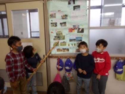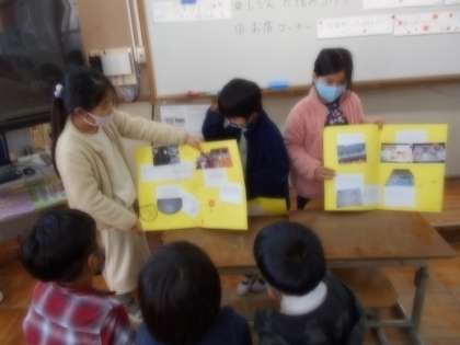 まちたんけんで調べてきたこと、「すてきだな。」と思ったことを、伝え合う発表会をしました。グループごとに伝え方を考えたのですが、アルバム、紙芝居、劇、クイズ…と、色々な発表方法が出てきて、バラエティー豊かな発表内容になりました。