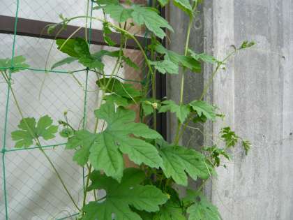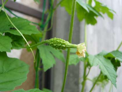 ツルレイシの果実は果肉が苦いため「ニガウリ」とも呼ばれ,また沖縄本島ではニガウリのことを「ゴーヤー」又は「ゴーヤ」とも呼ばれています。画像のツルレイシの赤ちゃんは,まだ2cm足らずの大きさですが,ドンドンと成長して美味しい果実になってくれることを願っています。