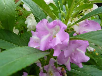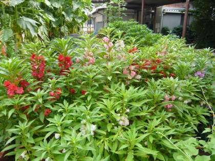 花壇に植えられたホウセンカやプランターに植えられたホウセンカは,たくさんの花を咲かせ,ピンクや赤の花が誇らしげ咲き競っています。