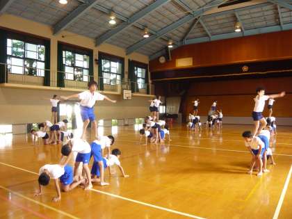 9月24日(土)の運動会の日まで,あと2週間足らずとなりました。今日の4時間目に5・6年生が,体育館で組体操の練習を行っていました。