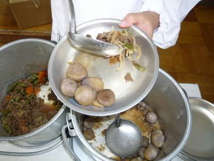 今日の「月見」の行事献立は,「ごはん」,「牛乳」,「牛肉のしぐれ煮」,「里いもの煮つけ」,「とうふの吉野汁」でした。「里いもの煮つけ」は,「三温糖」に「みりん」,「濃口醤油」などで味つけされていて,とってもおいしくいただくことができました。また,「牛肉のしぐれ煮」と「とうふの吉野汁」も,「里いもの煮つけ」と同じように,とってもおいしくいただくことができました。