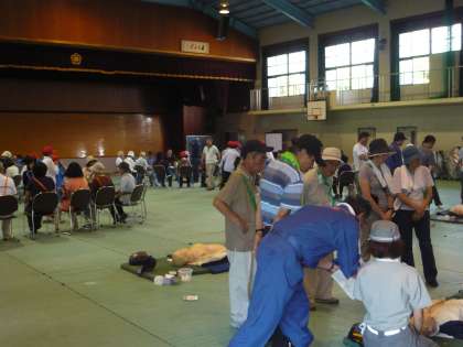 運動場では「バケツリレー」での消火や「簡易トイレ」の設置などが,体育館では「救命処置」や「包帯法」などの練習が行われています。参加された各町内会のみなさんは,真剣に訓練を行っておられます。今日の自主防災訓練は,正午までです。自主防災訓練の詳しい様子は,後日ホームページでお伝えします。