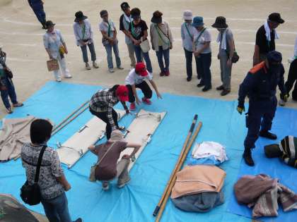 運動場では「バケツリレー」のほかに,簡易トイレを組み立てるコーナー(画像上)や毛布やTシャツを使ってタンカをつくるコーナー(画像中),倒壊家屋からジャッキを使って下敷きなった人を助けるコーナー(画像下)もありました。いずれのコーナーでも実際に体験をしたり,説明に聞き入ったりされていました。