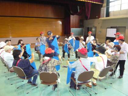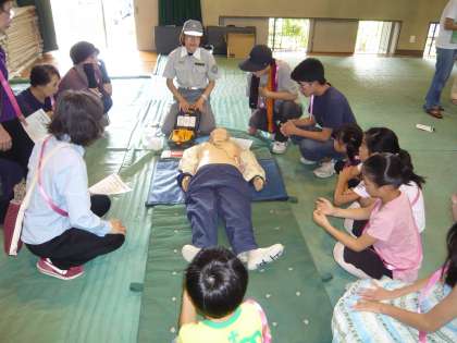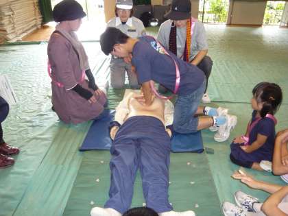運動場の4つのコーナーのほかに,体育館にも2つのコーナーが設けられていました。一つは「救命処置」のコーナー(画像上と中)で,「心肺蘇生法」と「AED使用法」を人体模型を使って心臓マッサージをしたり,人工呼吸をしたり,AED使ったりして,実際に体験されていました。もう一つのコーナーは,三角巾を使った応急処置の「包帯法」のコーナー(画像下)でした。体育館の2つのコーナーともに,参加されたみなさんは真剣に体験されていました。
