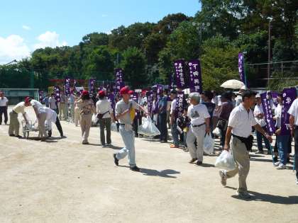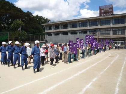 いよいよ「自主防災訓練」も,最後となりました。運動場に張られたテントの前に,消防分団の方々が南端に並び,その北側に町の旗を先頭に町ごとに整列して,閉会式が始まりました。閉会式は上京区長の挨拶から始まり,上京消防署長の講評,自主防災会会長の挨拶と続きました。最後にリヤカーに積まれた「救援物資」が到着し,各町に救援物資が配られました。ちなみに救援物資は,お茶と三角巾又はお茶とホイッスルでした。