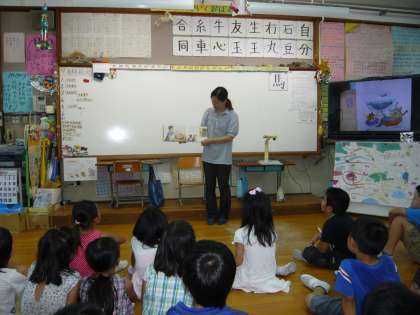 毎週水曜日午前8時30分から8時45分の15分間,京極小学校の子どもたちに「読み聞かせ」を行っていただいている,京極小学校図書ボランティア「かしの木」の読み聞かせが,今日は1・3年生とみどり学級の教室でありました。