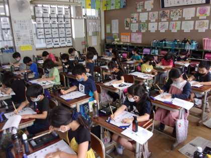 【写真上】毛筆書写の時間に小筆を使って自分の名前を徹底的に練習しました。一人一人に与えられた名前の手本をじっくり眺め,文字の大きさや字形に気をつけて書きました。