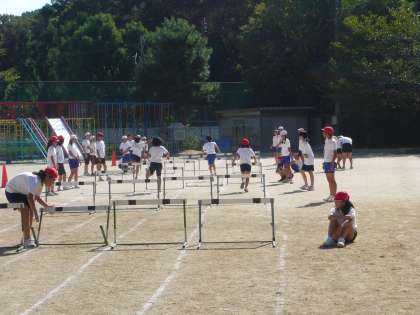 50mのコースに置かれたハードル5台を,5・6年生の子どもたちはフォームに気をつけてまたぎ越す練習をした後,5年生から順に担任先生の合図でスタートしていきました。勢いをつけてハードル5台をまたぎ越し,最後にダッシュしてゴール。高学年の見ごたえのあるハードル走が,運動会当日は見られそうです。