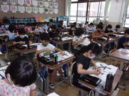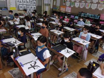 【写真上・中】毛筆書写「大」の清書に取り組みました。筆圧に関しては,「左はらい」は,だんだん力をぬき,「右はらい」は,だんだん力を入れることを意識しました。仕上がった作品は,階段の踊り場と教室に掲示中です。三者懇談会で来られた際に,是非ご覧ください。