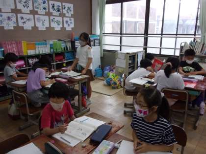 【写真下】国語では,発表会をしました。「仕事のくふう,みつけたよ」をテーマに組み立てを考えて書いた報告文を交流しました。聞く側は,説明の仕方がどうであったか,調べた内容についてどう感じたかにポイントを絞って発表者に伝えました。