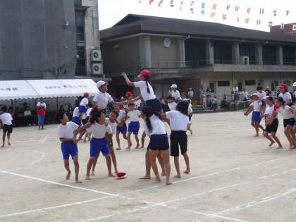 4人一組でつくった,騎馬で戦いました。騎馬戦は,上に乗っている人の帽子を取られたら負けです。勝負は「団体戦」,「一騎討ち」,「大将戦」の順に,3回戦行われました。結果は,1回戦の「団体戦」は,赤3騎,白2騎が残り,赤組が勝ちました。2回線の「一騎討ち」は,赤1騎,白4騎が残り,白組が勝ちました。そして決勝の3回戦目の「大将戦」は,開始早々に白組の大将の帽子が取られ,結局2勝1敗で赤組が騎馬戦を制しました。