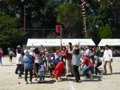 赤と白に分かれて,おじいさんやおばあさん,来賓の方々,PTAの方々,教職員が,玉入れに挑戦しました。結果は1回戦は赤組,2回戦は白組,3回戦は引き分け,そして4回戦目は白組が勝ち,2勝1敗1引き分けで白組が勝ちました。