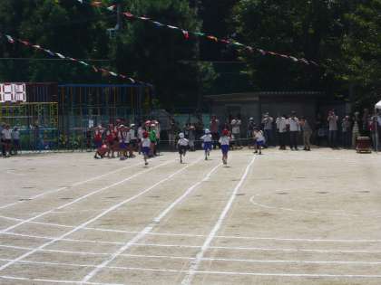 1年生は,小学校に入学して初めての運動会でした。「位置について」,「ヨーイ」,「ドン」という,スタートの仕方から練習をしました。少し緊張していたようですが,ゴールめざして力いっぱい走っていました。