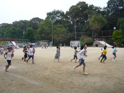 中間休みが始まると業間体育の始まりの音楽を合図に,運動場の各学年の所定の場所に子どもたちは集まり,マラソンの音楽が鳴り出すと走り始めました。低学年は運動場に張られたラインに近いコースを,高学年はラインより4mほど外側を走りました。「ふざけない」,「しゃべらない」,「手をつながない」などのマラソンのきまりをしっかりと守って,全校130人の子どもたちは今日から当分の間,毎日がんばって5分間走り続けます。
