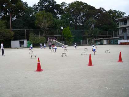 1年生の子どもたちの行っている「りれーあそび」は,コース上の2つの椅子に置かれた赤白玉を置き換える,「おきかえリレー」です。チームは4〜5人で1チームをつくり,4チームあります。1年生の子どもたちはルールをしっかりと守って,チームのためにがんばって走ったり,相手チームと競争することを楽しんだりしています。