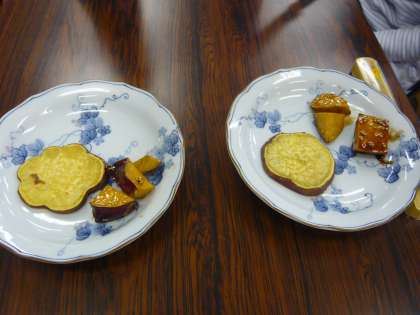 2年生ががんばって大きく育て,収穫したばかりの「サツマイモ」を使って調理し,1年生を招いて2・3時間目に,「おいもパーティー」を行いました。